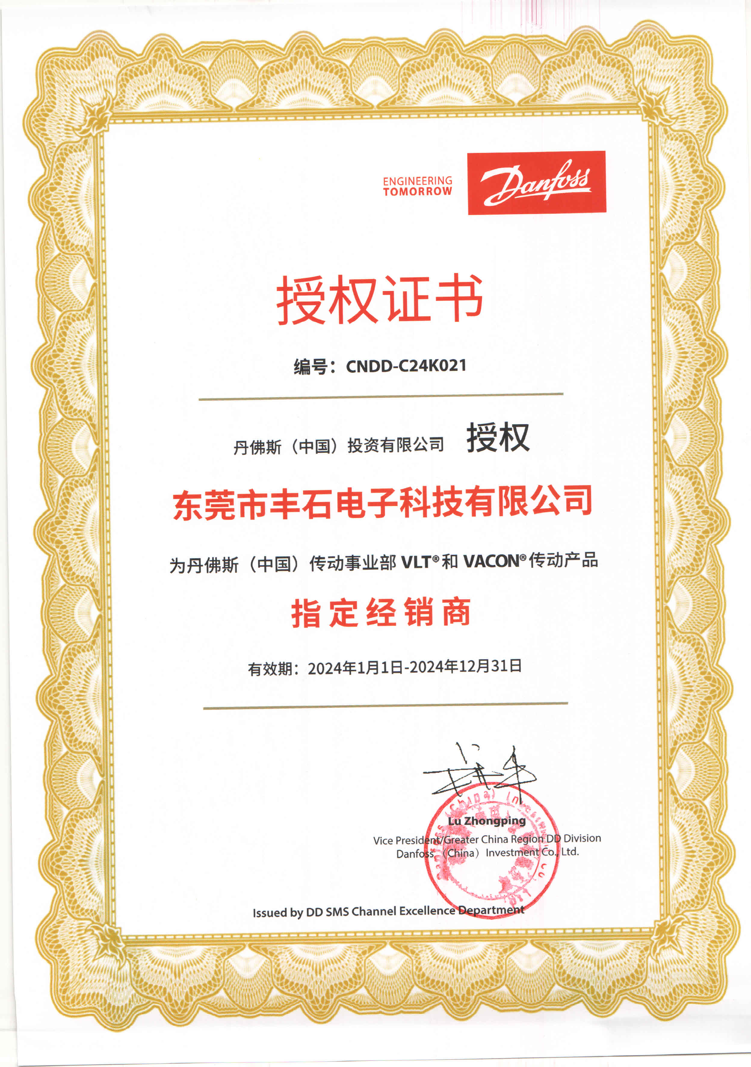 2424年丹佛斯一級代理授權書